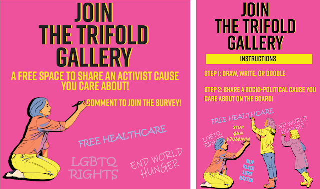 The Trifold Gallery is an interactive intervention created to survey the socio-political awareness of the NJCU campus, along with some outside responses. The gallery is on a poster board where participants are encouraged to draw on post-it notes and provide an activist cause. In the few moments they spend doodling, they are actively thinking about activist causes at the back of their mind. The project started on Thursday with post-it notes; I went around to classmates with who I engaged in conversation before presenting them with the project. Sometimes they would ask what kind of politics I wanted, and I emphasized how it could be any activist cause they deemed significant in their lives. Participants provided important causes such as gun violence, environmental issues, LGBTQ rights, trans rights, mental health, abortion rights, and many more. These are all causes people are aware of; I also received one for deaf accessibility and another post-it note speaking for the accurate cultural representation of Brazil. On Tuesday, when the university was remote, I decided to expand this project online, where I received outside responses that I interpreted in doodles, such as the Russian corruption post-it note. This expanded my survey sample outside of the NJCU campus, but overall, the responses I have so far are based on college students' perspectives. While the project fostered the participants' creativity, it was also research for my future project. I based this intervention on Alfredo Jarr's twenty-four-hour museum, where he invited townspeople to hang up their art. The Art of Activism states, "some projects are tied tightly to campaigns, while others skirt on the edges of what we traditionally think of as politics: raising questions, opening spaces, and providing perspectives" ( Ducombe, Lambert, 2021, pg.43). With the Trifold gallery I aimed to raise individual awareness about activists projects and provide a space for people to share their artwork and perspectives. While this project is not solely focused on one particular socio-political cause, it can be a part of a greater campaign that can be worked on for my second intervention. Regarding research, The Art of Activism states, "Research provides content for our work, we find insights and inspiration in everything." ( Ducombe, Lambert, 2021, pg.62). In this case, I was engaging with other people and inviting them to open up about activists' causes. In these conversations, I learned a lot about the individual and what my peers care about most politically.